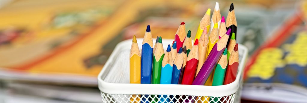Cahiers, stylos, crayons, feutres, scotch, colle, taille crayons, gomme, …