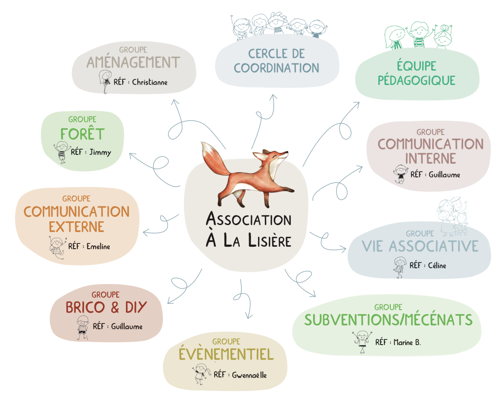 Pour cela, des cercles de travail ont été créés. Ils correspondent à des domaines d’activité spécifiques (entretien et aménagement de l’école, recherche de subventions, communication, vie associative…).