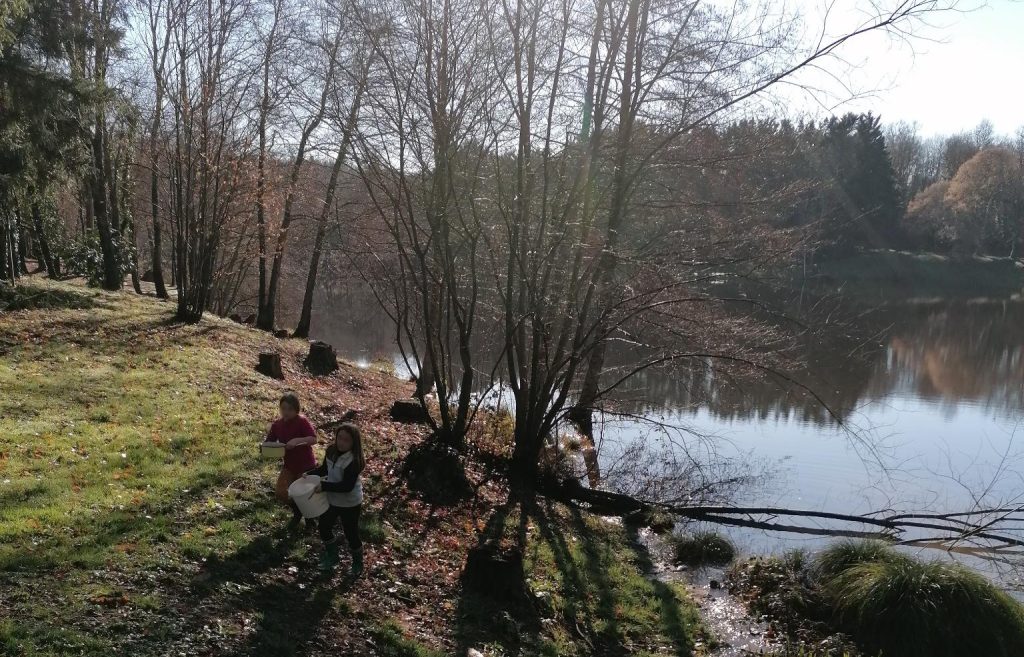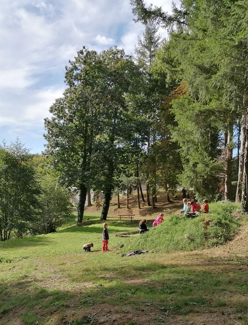 Un espace extérieur attenant (jardin et cour) permet aux enfants de se retrouver et d’accéder aux berges de l’étang. Une parcelle de forêt de presque 1 hectare est mise à disposition à quelques centaines de mètres de l’école.