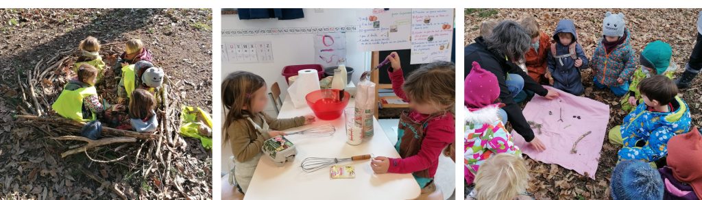 La diversité qu’offre la nature permet aux enfants de développer leurs sens et leurs compétences sociales et motrices, de renforcer quotidiennement des savoirs-faire (utiliser des petits outils, accrocher, nouer, porter, ficeler etc.), des savoir être (aider, se respecter, respecter l’autre et l’ensemble du vivant etc.)… Par l’expérience, le jeu et l’observation, ils s’initient à la botanique, enrichissent leur langage, s’imprègnent de toute la vie de l’écosystème du vivant qui les entoure et nourrissent naturellement leur sentiment d’appartenance à la nature.